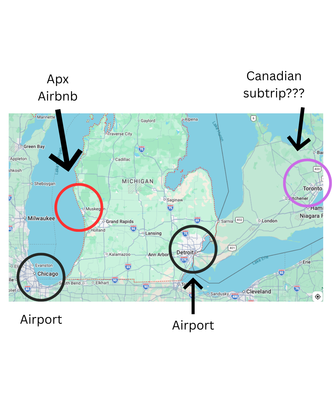 | Chicago + Lake Michigan | – Chicago / Detroit are both large airport hubs (avg price from SFO $400) – Big city + lake house + national parks – Close enough to do a Canadian side trip – Overall, quite affordable for 4 nights 5 days | – 2 hr drive from either airport | Airfare ~400 House ~300 Misc ~200 Total ~900 |